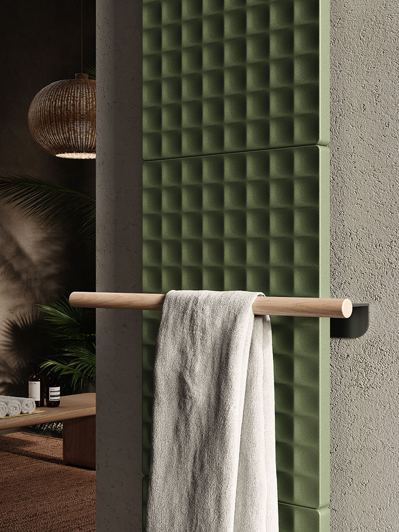Disponibile in verticale e in orizzontale, il ritmo costante dei pieni e dei vuoti, ne evidenzia una scansione armonica. Proposto in una gamma di cromie speciali, tra cui alcune in versione goffrata, può essere formato da un minimo di quattro fino a otto elementi, selezionabili in differenti lunghezze (100, 150, 180 e 200 cm), e accessoriabile con ganci e portasalviette in acciaio inox lucidato che lo rendono ideale per l’ambiente bagno.