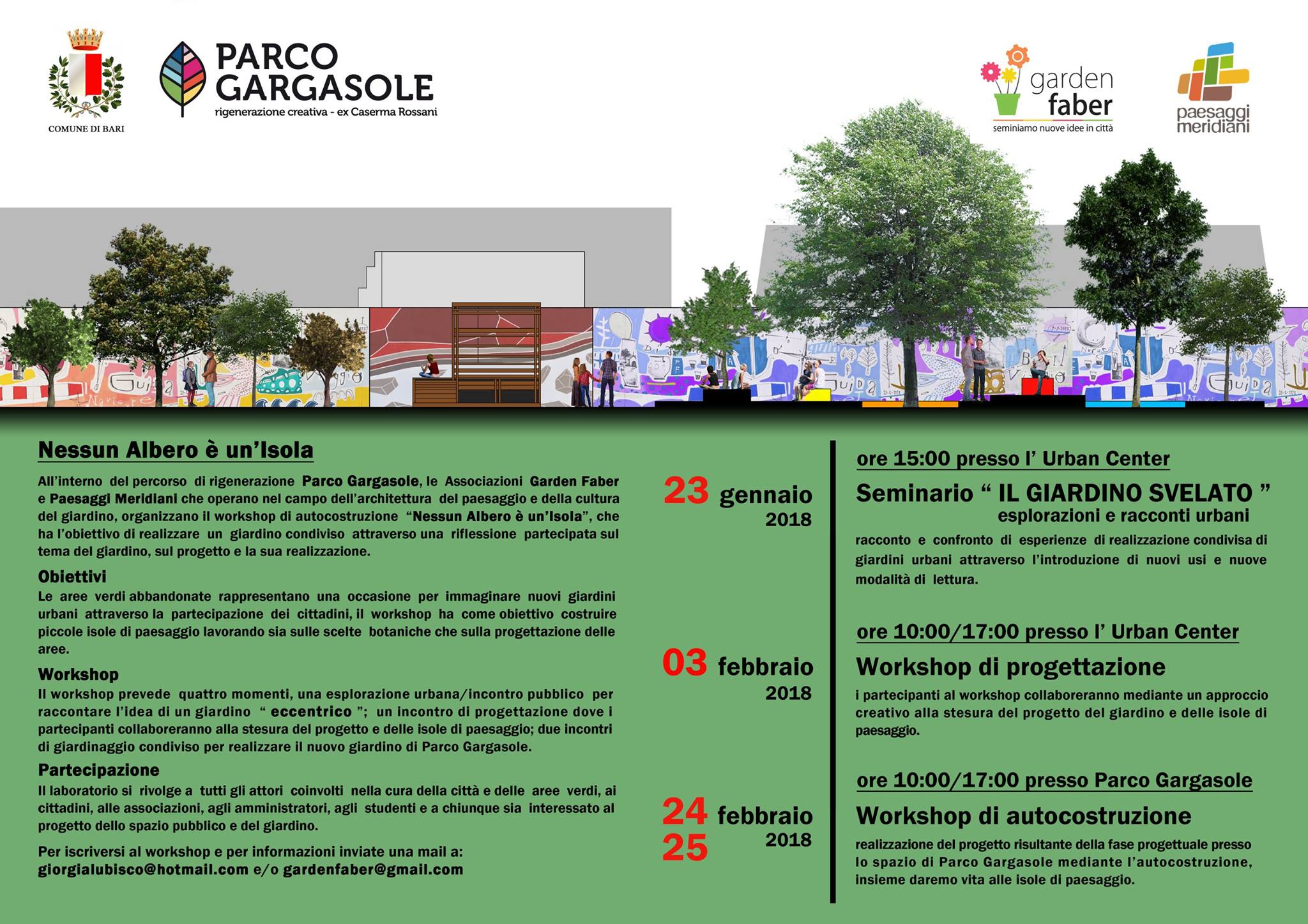 Il workshop è articolato attraverso tre appuntamenti, il primo, il 23 gennaio alle 15.00 presso l'Urban Center sarà dedicato ad un dibattito sul tema del giardino, durante la giornata del 3 febbraio, presso l'Urban Center e il Parco Gargasole, incomincerà il laboratorio di progettazione condivisa e infine nelle giornate del 23 e 24 febbraio al Parco Gargasole si terrà il workshop di costruzione e giardinaggio.