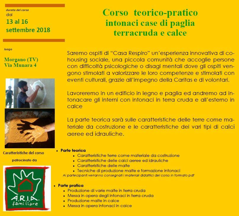 L'associazione A.R.I.A. Familiare promuove un corso dedicato agli intonaci naturali in terra cruda e calce all'interno del co-housing sociale Casa Respiro, una piccola comunità che accoglie persone con difficoltà psicologiche e mentali, dove gli ospiti vengono stimolati grazie alle attività dei volontari e all'impegno della Caritas.