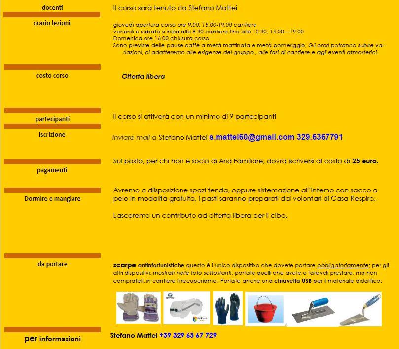 Il workshop, guidato da Stefano Mattei, prevede una parte teorica incentrata sulle caratteristiche delle terre come materiale da costruzione e le proprietà dei vari tipi di calci aeree ed idrauliche, ed una parte pratica in cui i partecipanti lavoreranno all'interno di un edificio costruito in legno e paglia e si occuperanno di intonacare gli interni con intonaci in terra cruda e l'esterno in calce, grassello di calce e finitura in cocciopesto giallo.