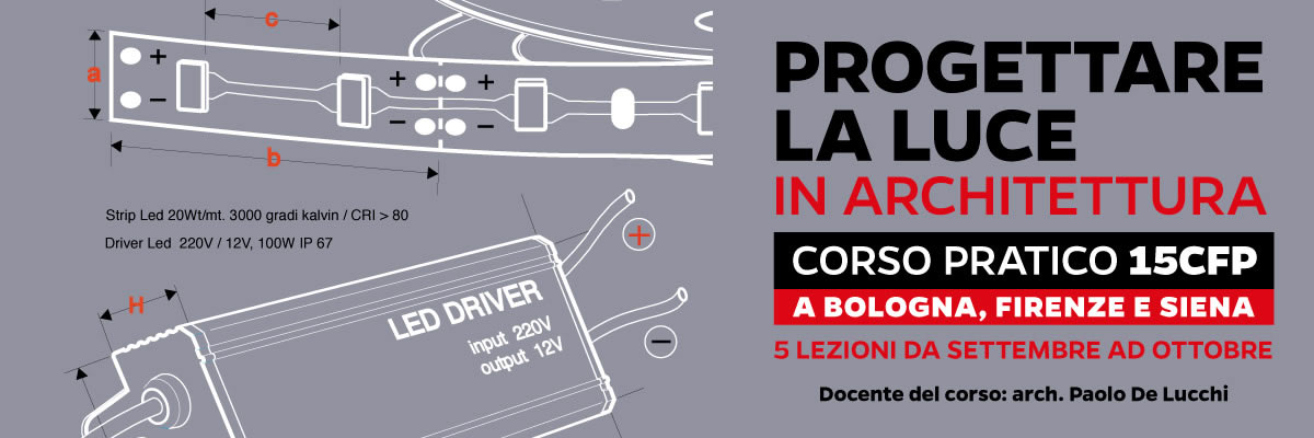 Nel mese di settembre partirà "Progettare la luce in architettura" il corso pratico organizzato da De Lucchi Workshop a Bologna e Firenze, e dall'Ordine degli architetti di Siena nella omonima città, dedicato a chi vuole approfondire gli ambiti della progettazione della luce secondo la destinazione d'uso.