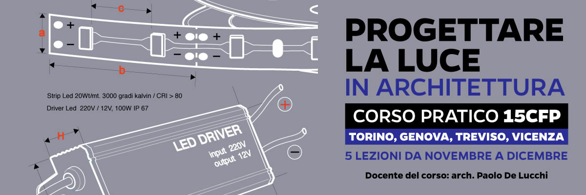 Il corso tenuto da Paolo De Lucchi, architetto e lighting designer è aperto agli architetti, lighting designer, interior designer, creativi, studenti e interessati alla materia, e mira a fornire strumenti concreti attraverso i quali progettare correttamente l'illuminazione mediante l'utilizzo di cataloghi e schede tecniche.