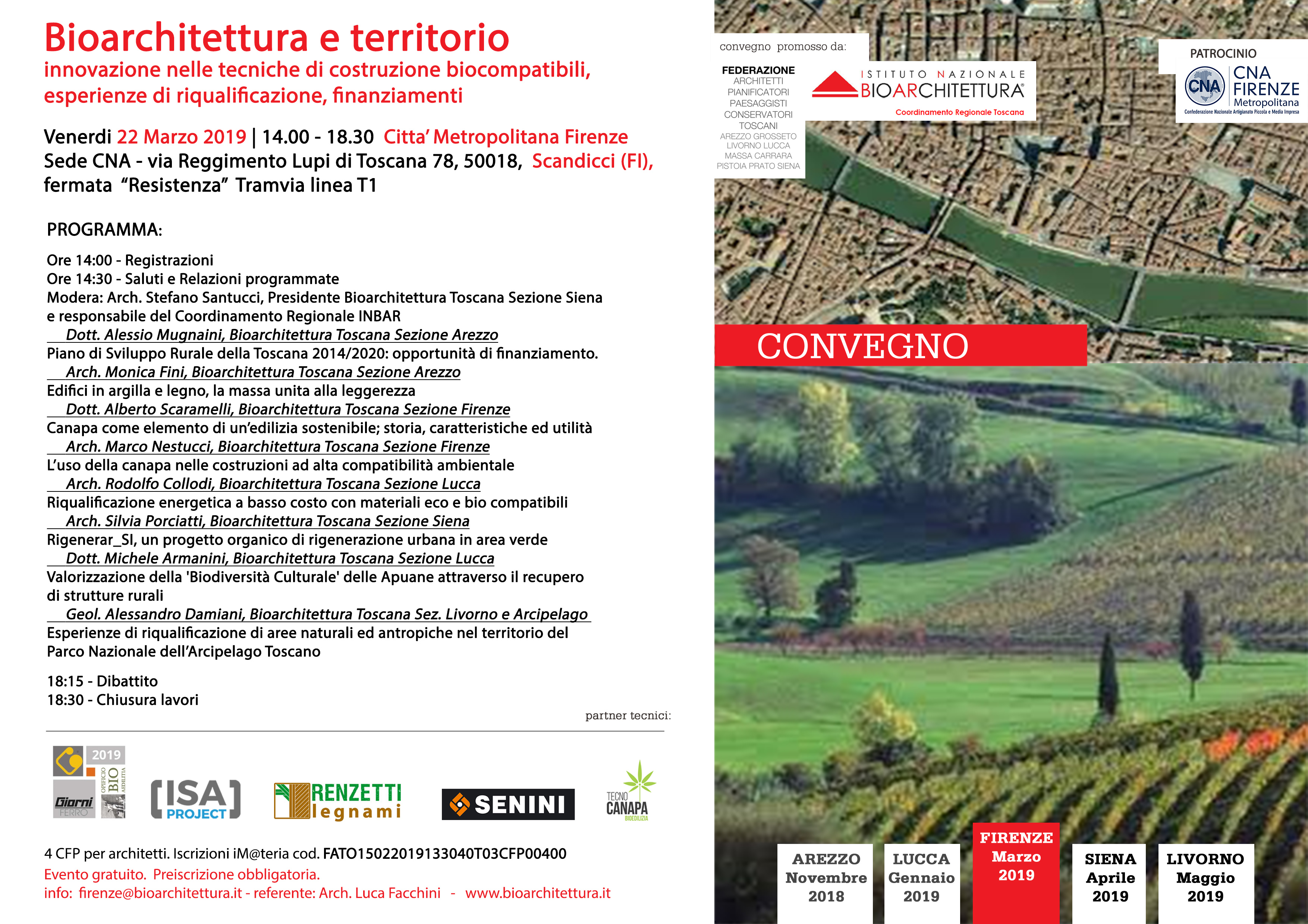 L'iniziativa, dopo il primo appuntamento svoltosi ad Arezzo, proseguirà tra gennaio e giugno 2019 nelle rimanenti aree di appartenenza delle Sezioni Toscane dell'Istituto Nazionale di Bioarchitettura: Livorno e Arcipelago Toscano, Lucca, Firenze e Siena.