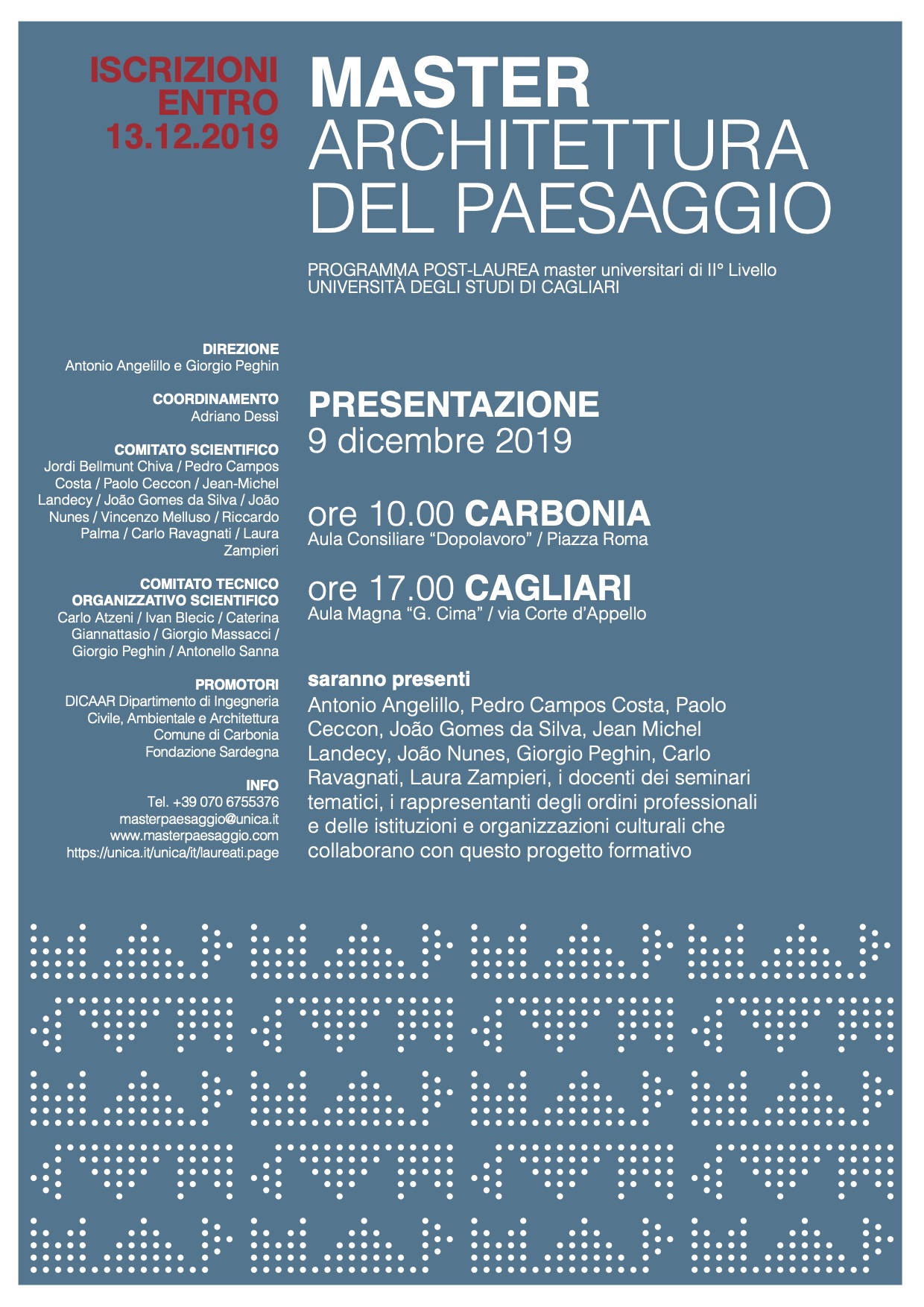 Sarà presentato a Cagliari e Carbonia lunedì 9 dicembre il master di II livello in "Architettura del Paesaggio", promosso dall'Università degli Studi di Cagliari in collaborazione con il Comune di Carbonia e la Fondazione Sardegna, e la direzione dei prof. Giorgio Peghin e Antonio Angelillo.