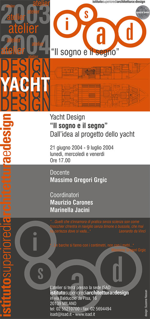 PRIMA SETTIMANA: Il corso inizia con una visita di un Cantiere Navale e di uno yacht in acqua. In sede, è indicata una bibliografia essenziale. Viene illustrata la struttura del progetto dello yacht, dal primo contatto col Committente, al progetto di massima, attraverso i piani esecutivi fino alla barca finita. I disegni, relativi ad uno yacht realmente costruito, sono proiettati su lavagna luminosa Particolare attenzione viene dedicata al piano di carena e di coperta ed al piano delle strutture, che costituiscono il nucleo di base sul quale viene svolto il lavoro del seminario. Al termine della sessione di lavoro viene proiettato un breve filmato VHS, dove è ripreso lo stesso yacht. Il filmato è descrittivo degli interni ed è completato da riprese dello yacht in navigazione, dall’elicottero.