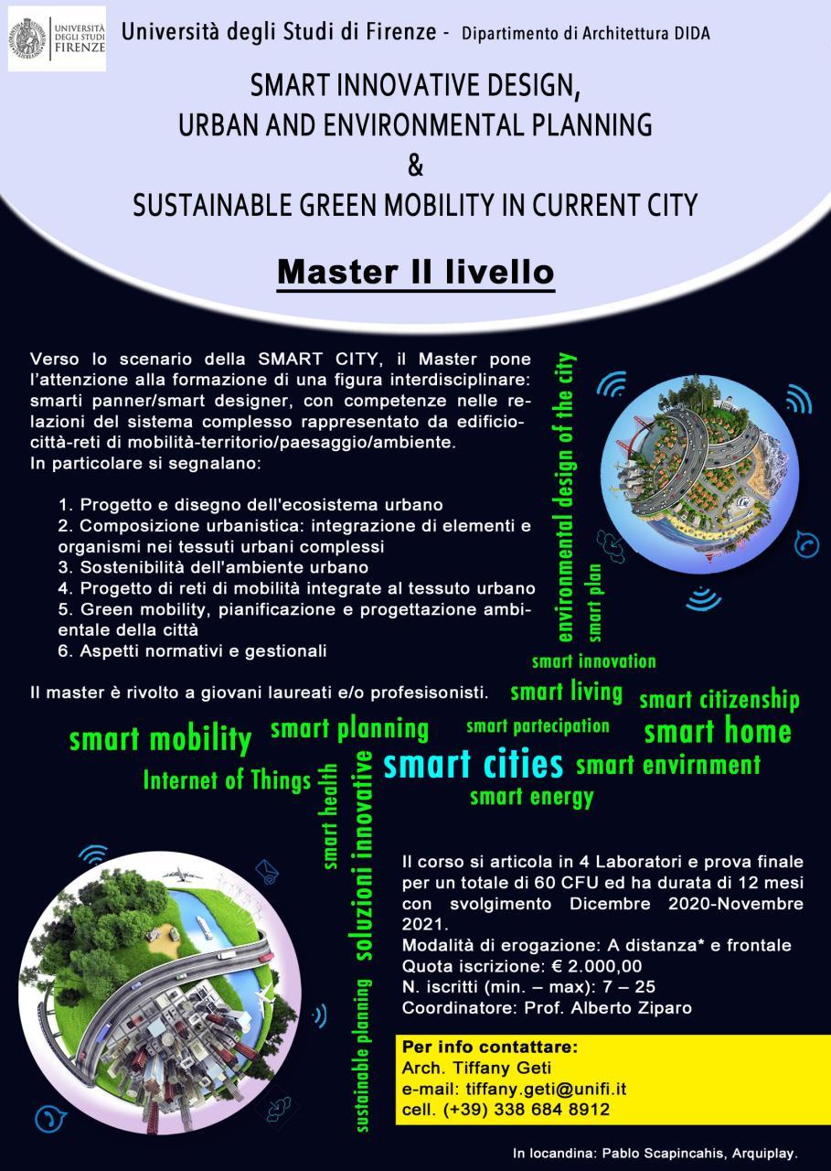 Sono aperte le candidature per il master di II livello in Smart innovative design, urban and environmental planning and sustainable green mobility in current city, promosso dall'Università di Firenze Dipartimento di architettura DIDA, per l'A.A.2020-21.
