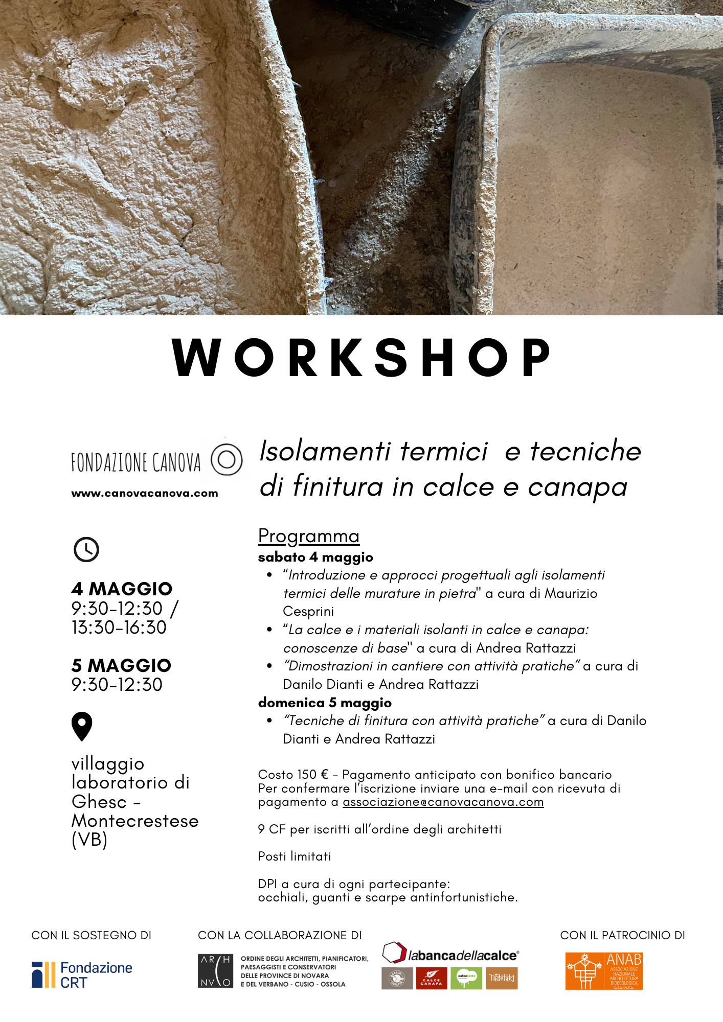 La conoscenza di questi materiali e delle loro applicazioni è fondamentale per i professionisti orientati alla sostenibilità. Per questo motivo, la Fondazione Canova - da anni impegnata nella valorizzazione del patrimonio storico architettonico attraverso attività didattiche, divulgative ed artistiche - organizza un workshop interamente dedicato all'approfondimento degli isolamenti termici e finiture in calce e canapa.