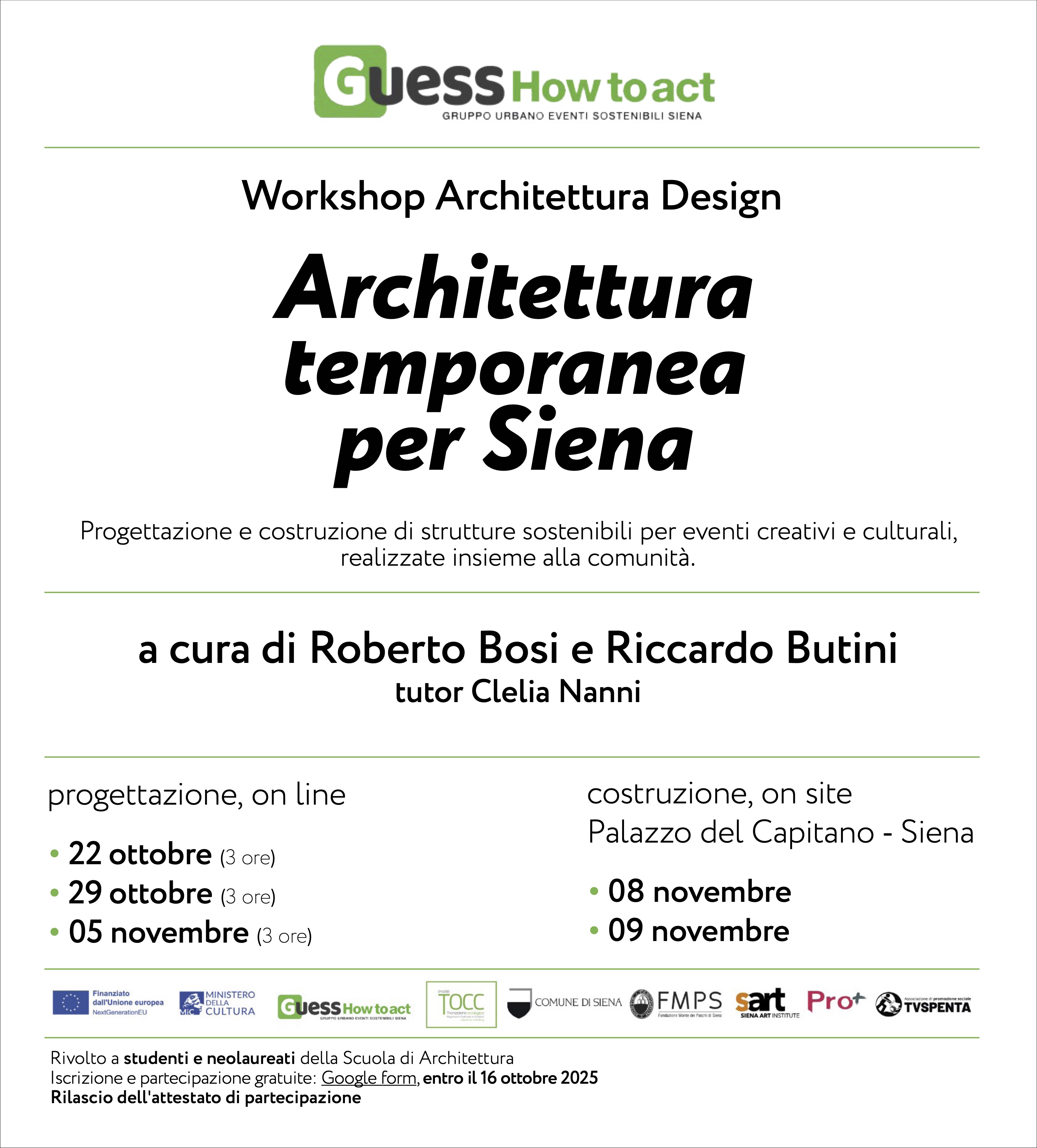 Sono aperte le iscrizioni ad Architettura per Siena, il workshop - online e on site - promosso nell'ambito del programma di capacity building GUESS finanziato dal Ministero della Cultura come parte del Progetto NGEU - Next Generation EU e finalizzato alla realizzazione di strutture ed elementi sostenibili per eventi creativi e culturali.