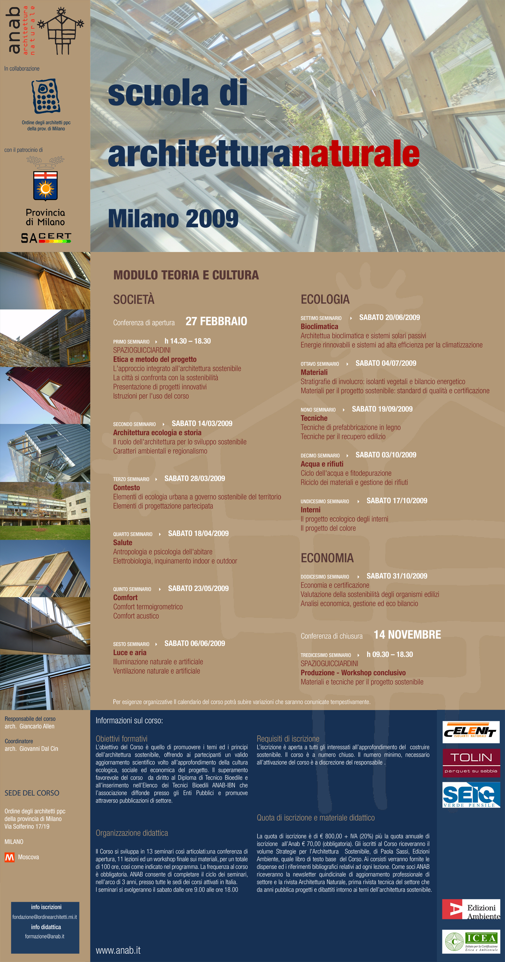 Obiettivi: L'obiettivo del corso è quello di promuovere i temi ed i principi dell'architettura sostenibile, offrendo ai partecipanti un valido aggiornamento scientifico volto all'approfondimento della cultura ecologica, sociale ed economica del progetto. Il superamento favorevole del corso da diritto al Diploma di Tecnico