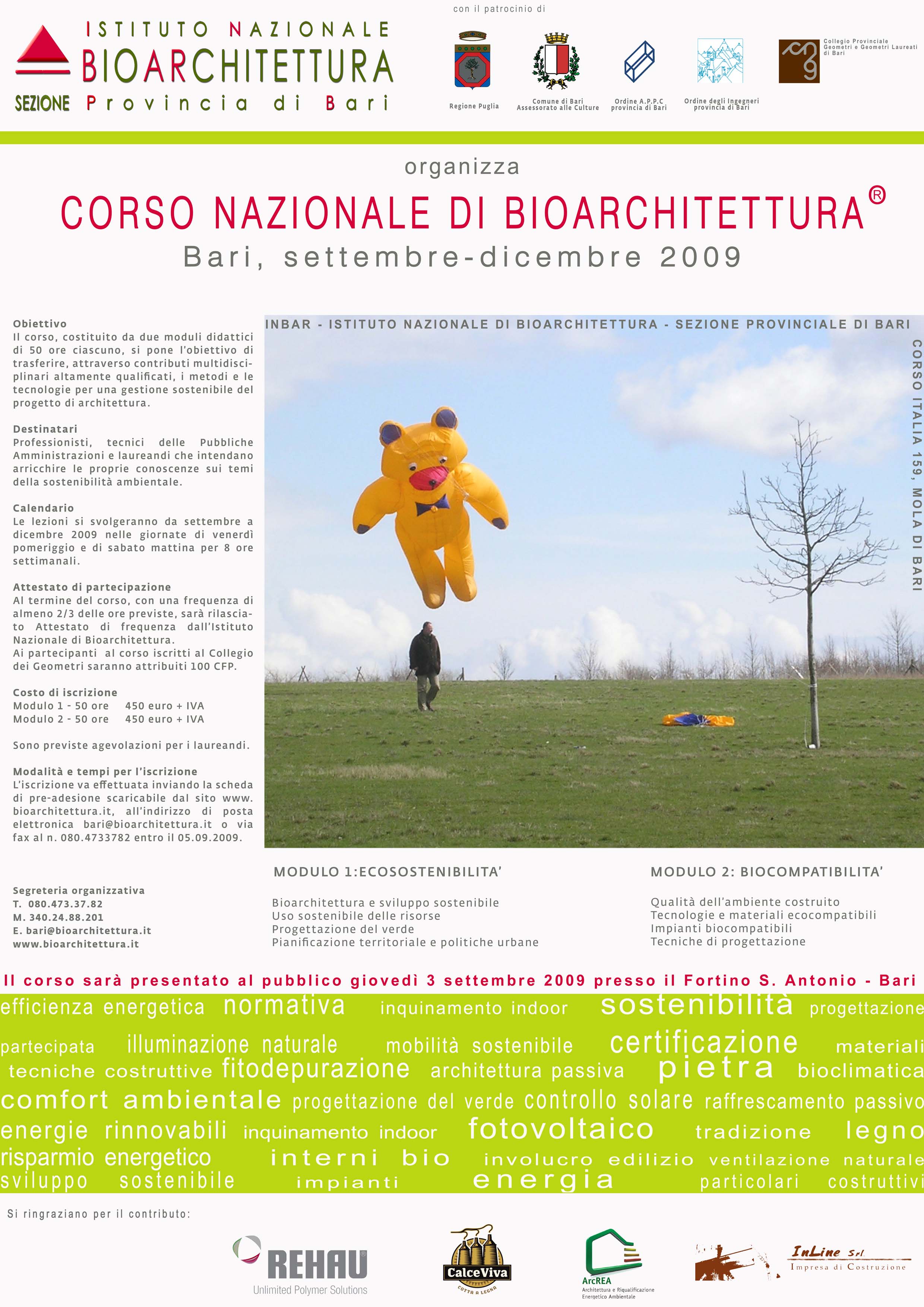La sezione Provinciale di Bari dell'Istituto Nazionale di Bioarchitettura® promuove un corso base di formazione in bioarchitettura® con il patrocinio di Regione Puglia, Comune di Bari, Ordine degli Ingegneri della Provincia di Bari, Ordine degli Architetti, P.P.C. della Provincia di Bari e Collegio dei Geometri della Provincia di Bari.