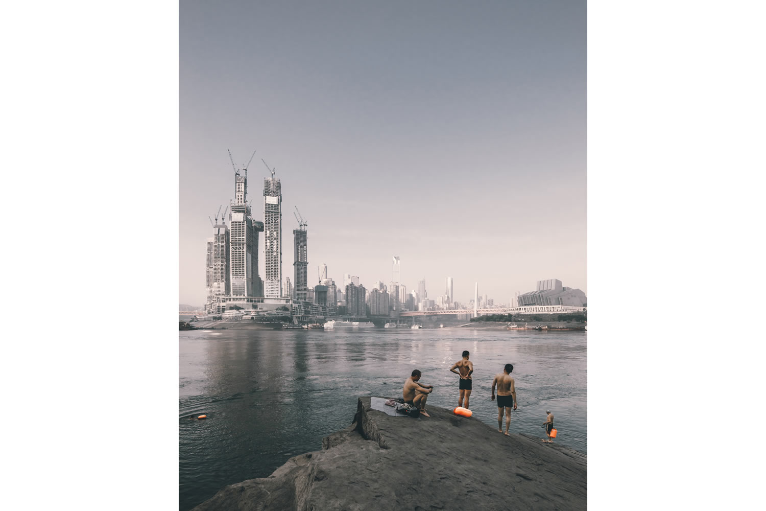 Swimmers on the riverside opposite the construction of Raffles City Chongqing, China by Safdie Architects