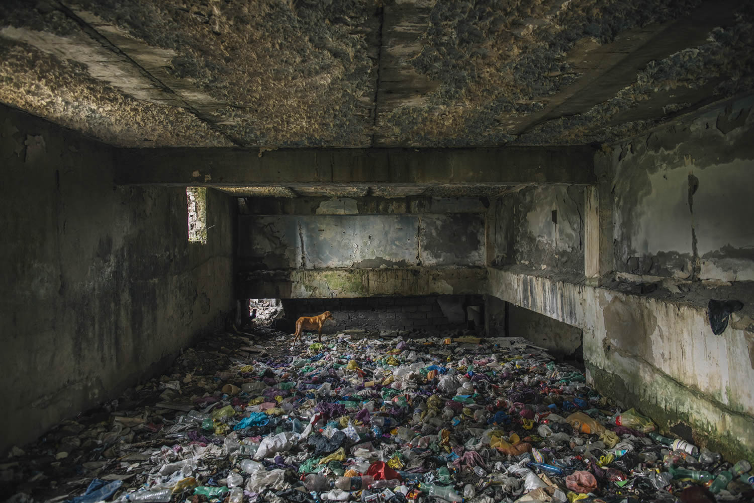 A Soviet-era Sanatorium “Sacartvelo” with a stray dog and rubbish, in the town of Tskaltubo in the former Soviet Republic of Georgia designed by architect Kalashniko