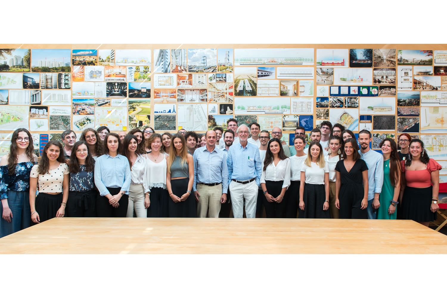 Renzo Piano, con i borsisti (Marco Lumini, Alberto Michielotto, Francesca Memo), il tutor (Edoardo Narne) e i volontari del progetto Borgomagno (Padova)