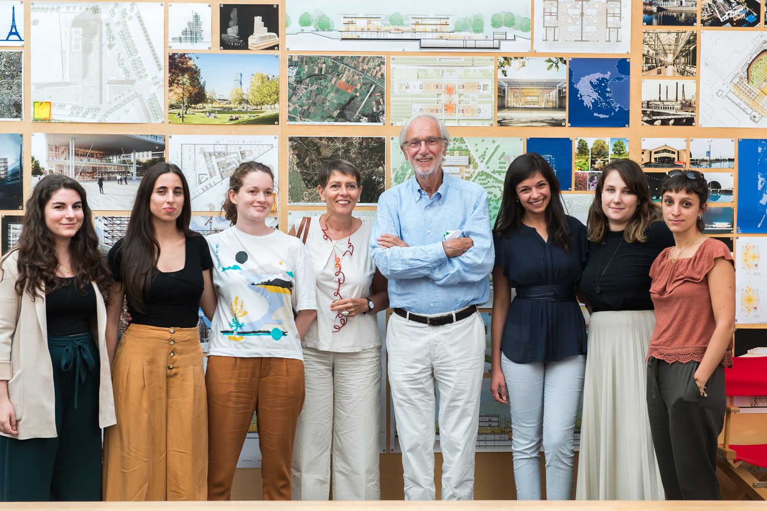 Renzo Piano, con le borsiste (Sara Sapone, Maria Giulia Atzeni, Alessia Cerri), la tutor (Raffaella Neri) e le volontarie del progetto Niguarda (Milano)