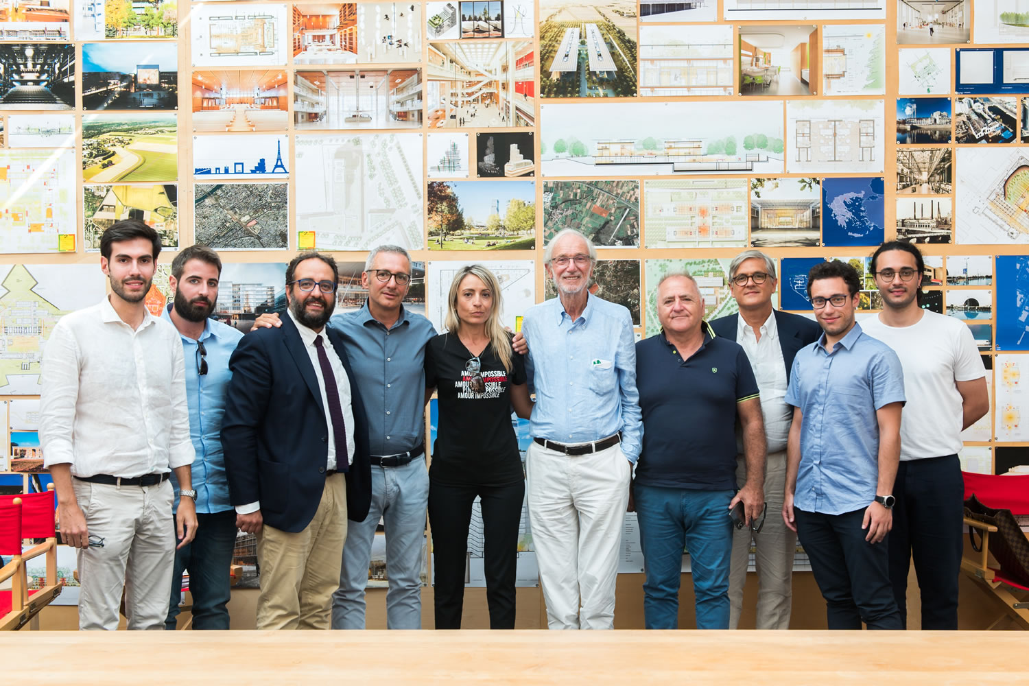 Renzo Piano, con i borsisti (Tommaso Bartoloni, Carmelo Antonuccio, Giuseppe Cultraro), il tutor (Bruno Messina) e i volontari del progetto Mazzarrona (Siracusa)