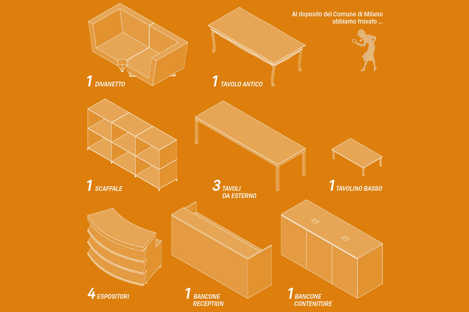 Inventario degli arredi da riutilizzare, recuperati da un deposito comunale.