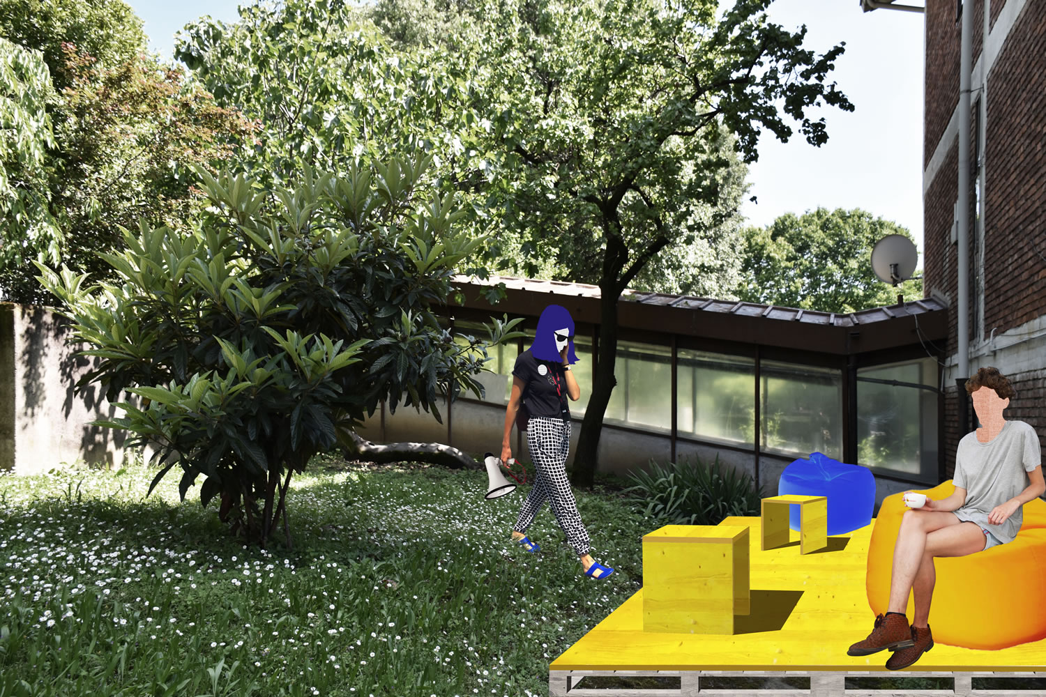 Progetto per un’area di incontro-relax all’interno del giardino dell’ex scuola.