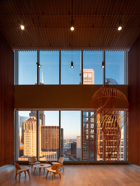 Al 32° piano di un grattacielo a Chicago lo studio Alvisi Kirimoto firma Private Office, 2600 mq di nuovi uffici direzionali sospesi tra le nuvole ma ben radicati nel contesto dell’ex quartiere industriale di West Loop.