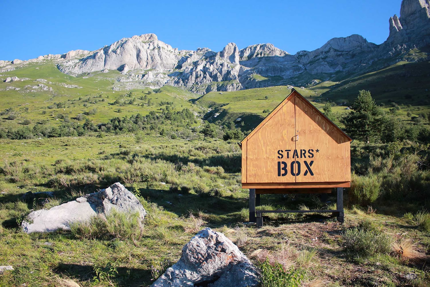 Una scatola di legno effimera con tetto apribile, dal quale guardare le stelle. Una struttura da smontare ad ogni stagione, che non lascia segni permanenti sul suolo al di sopra del quale dimora.