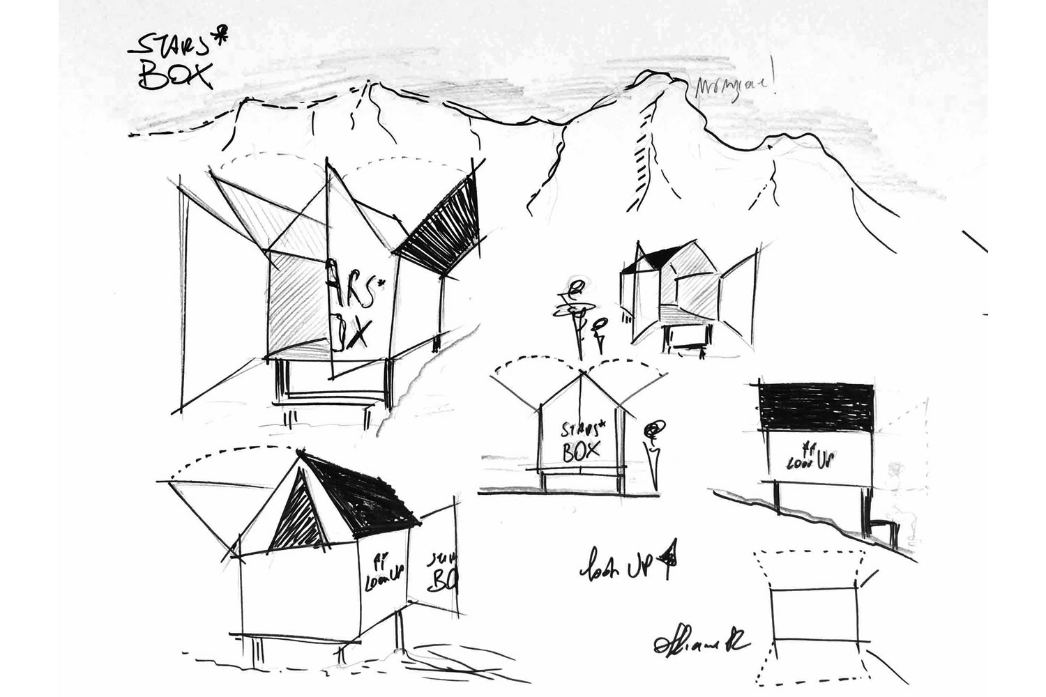 Una scatola di legno effimera con tetto apribile, dal quale guardare le stelle. Una struttura da smontare ad ogni stagione, che non lascia segni permanenti sul suolo al di sopra del quale dimora.