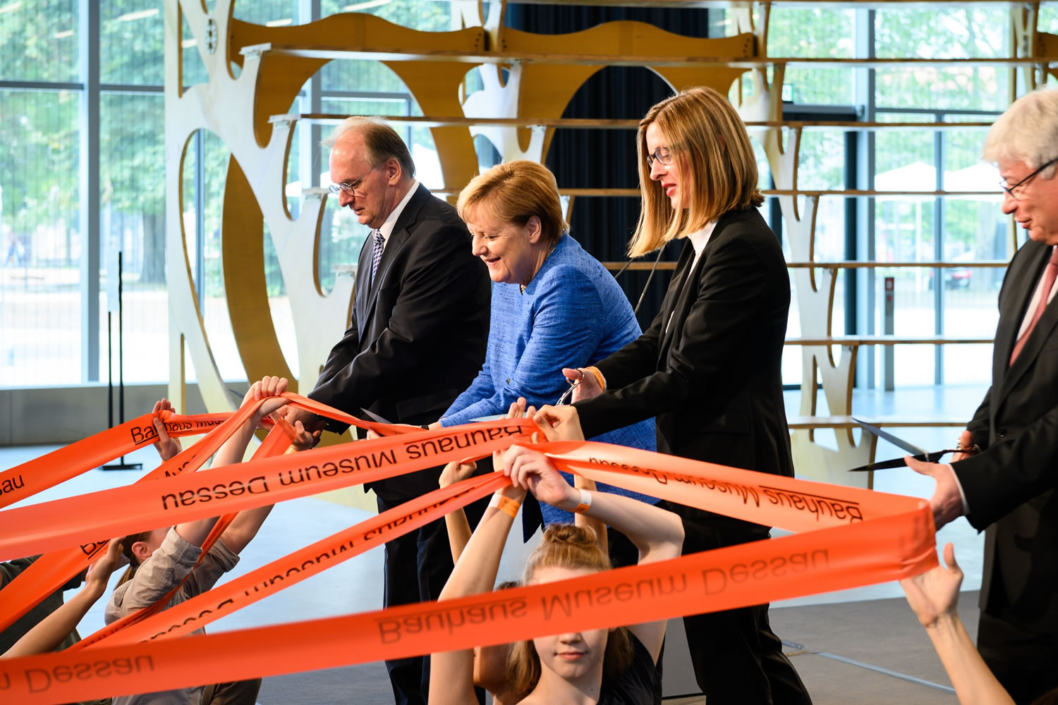 Nella foto: Reiner Haseloff primo ministro dello stato federale della Sassonia-Anhalt, Angela Merkel Federal Chancellor, Claudia Perren direttrice della Bauhaus Dessau Foundation e Peter Kuras, sindaco della città di Dessau-Roßlau.