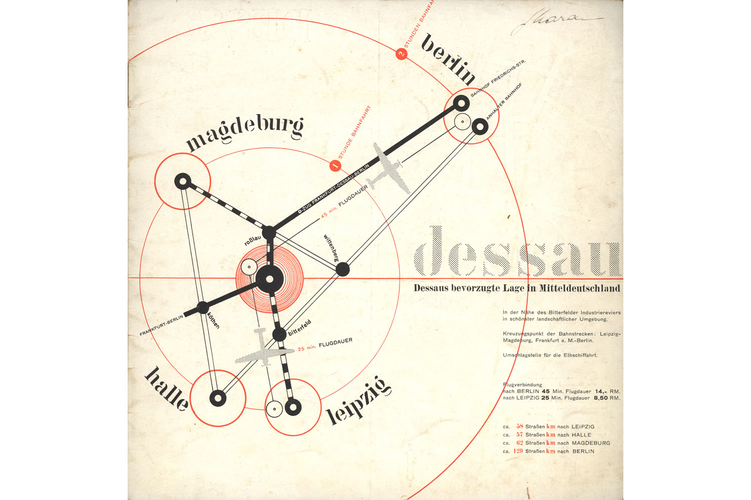Joost Schmidt (Entwurf), Ludwig Grote (Texte): Dessau – auf dem Boden alter Kultur – lebendiges Schaffen der Gegenwart. Gemeinnütziger Verein Dessau e. V., Abt. Verkehrsbüro (Herausgeber), 1931 – Buchdruck auf Kunstdruckpapier; Drahtheftung