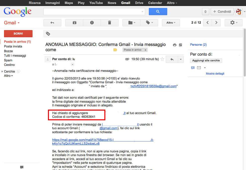 12. Apriamo il nostro programma di posta e andiamo a leggere il messaggio che Gmail ci ha spedito per confermare la proprietà della nostra casella PEC. È un messaggio che contiene errori (anomalia messaggio) perché proveniente da una fonte non certificata. Non ci facciamo caso. Quello che ci interessa è il Codice di conferma che dobbiamo riportare nella schermata delle impostazioni della casella Gmail. Si tratta mediamente di un numero di 8 cifre.