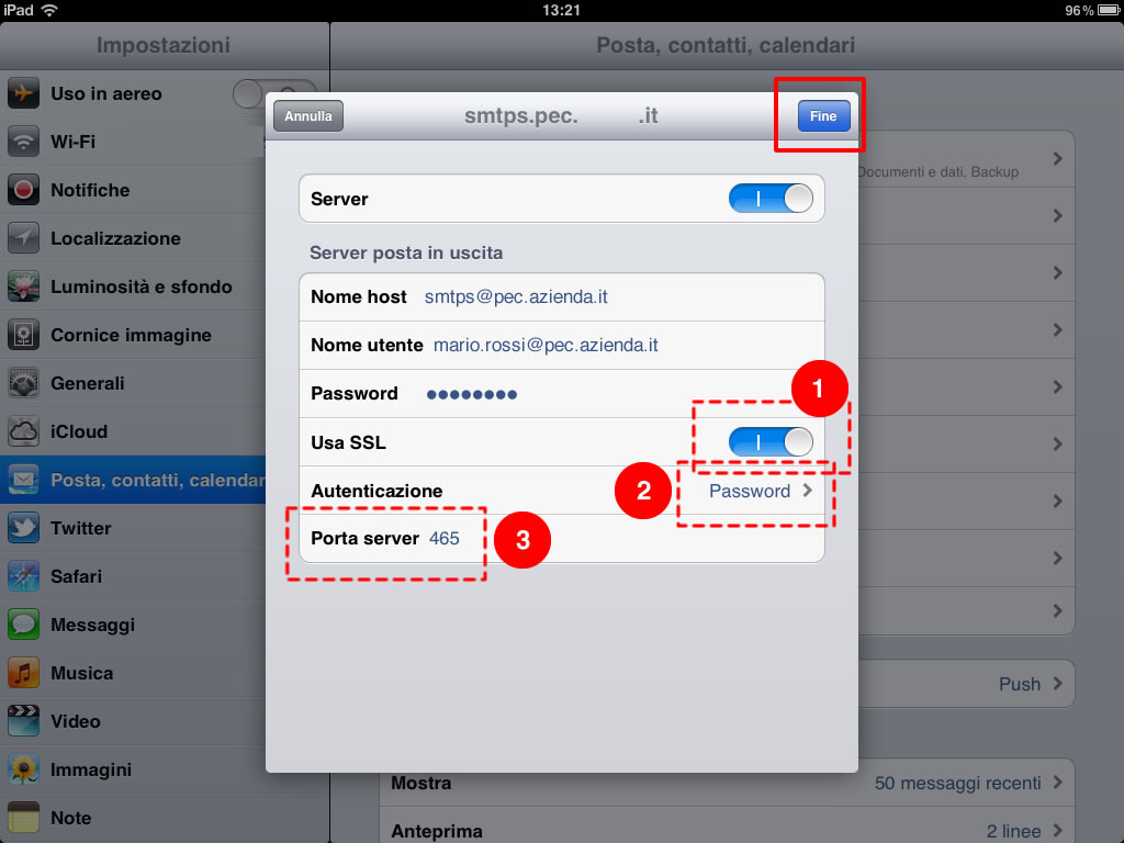 12. Il Protocollo va usato su una connessione protetta (Usa SSL: sì), l’autenticazione deve essere impostata a “Password”, e la porta del server in uscita dovrà corrispondere a quella specificata dal fornitore della casella PEC, nel caso di Aruba il numero della porta è 465.