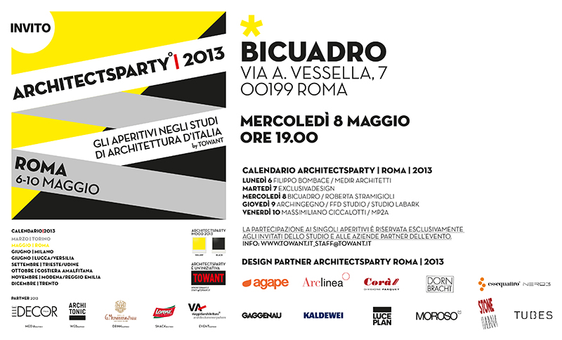 BiCuadro Architetti è stato selezionato tra gli studi di architettura romani che ospiteranno ArchitectsParty. Anche quest'anno l'evento coinvolgerà dieci studi di architettura della città, che per una sera diventeranno una location insolita per un aperitivo a base di creatività.