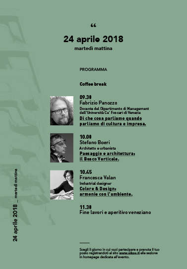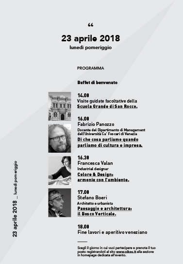 Ogni incontro sarà accompagnato dagli interventi del Prof. Fabrizio Panozzo dell'Università Ca' Foscari di Venezia, che parlerà del legame tra cultura e impresa, analizzando il rapporto architettura e management nella progettazione degli spazi e della industrial designer Francesca Valan che affronterà il tema del linguaggio del colore nel design e negli ambienti.