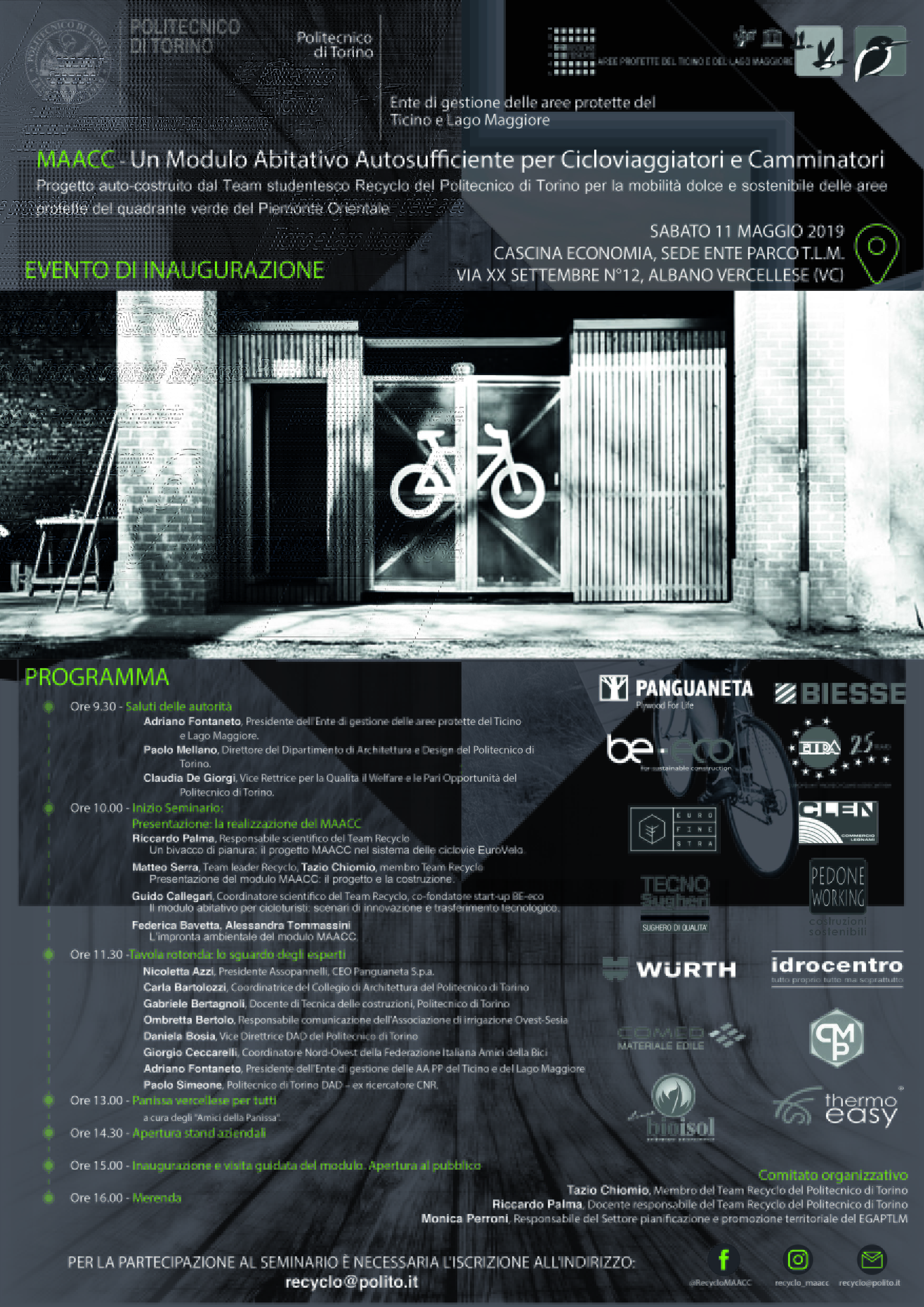 Inaugura sabato 11 maggio ad Albano Vercellese, presso la sede dell'Ente di gestione delle aree protette del Ticino, Lago Maggiore e Lame del Sesia, il primo prototipo del Modulo Abitativo Autosufficiente per Cicloviaggiatori e Camminatori (MAACC) realizzato dal Team Recyclo del Politecnico di Torino .