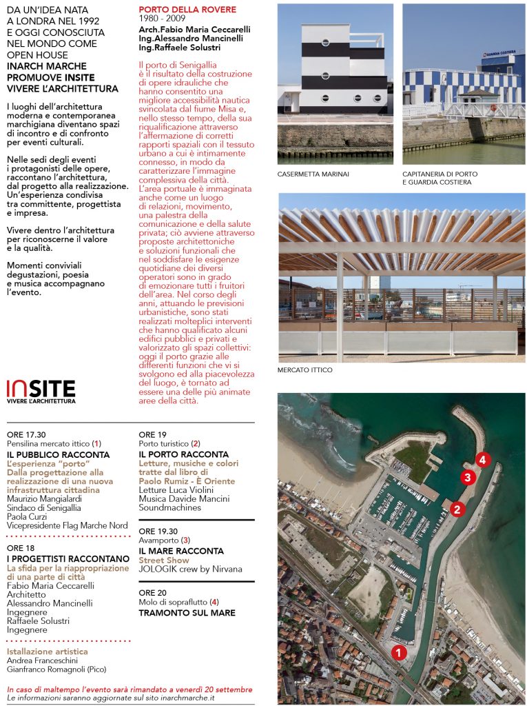 Si svolgerà venerdì 13 settembre nel porto di Senigallia il prossimo appuntamento di "IN-Site. Vivere l'architettura", un evento itinerante - organizzato dalla sezione Marche dell'Istituto Nazionale di Architettura - che porta il pubblico alla scoperta di luoghi virtuosi dell'architettura moderna e contemporanea marchigiana.