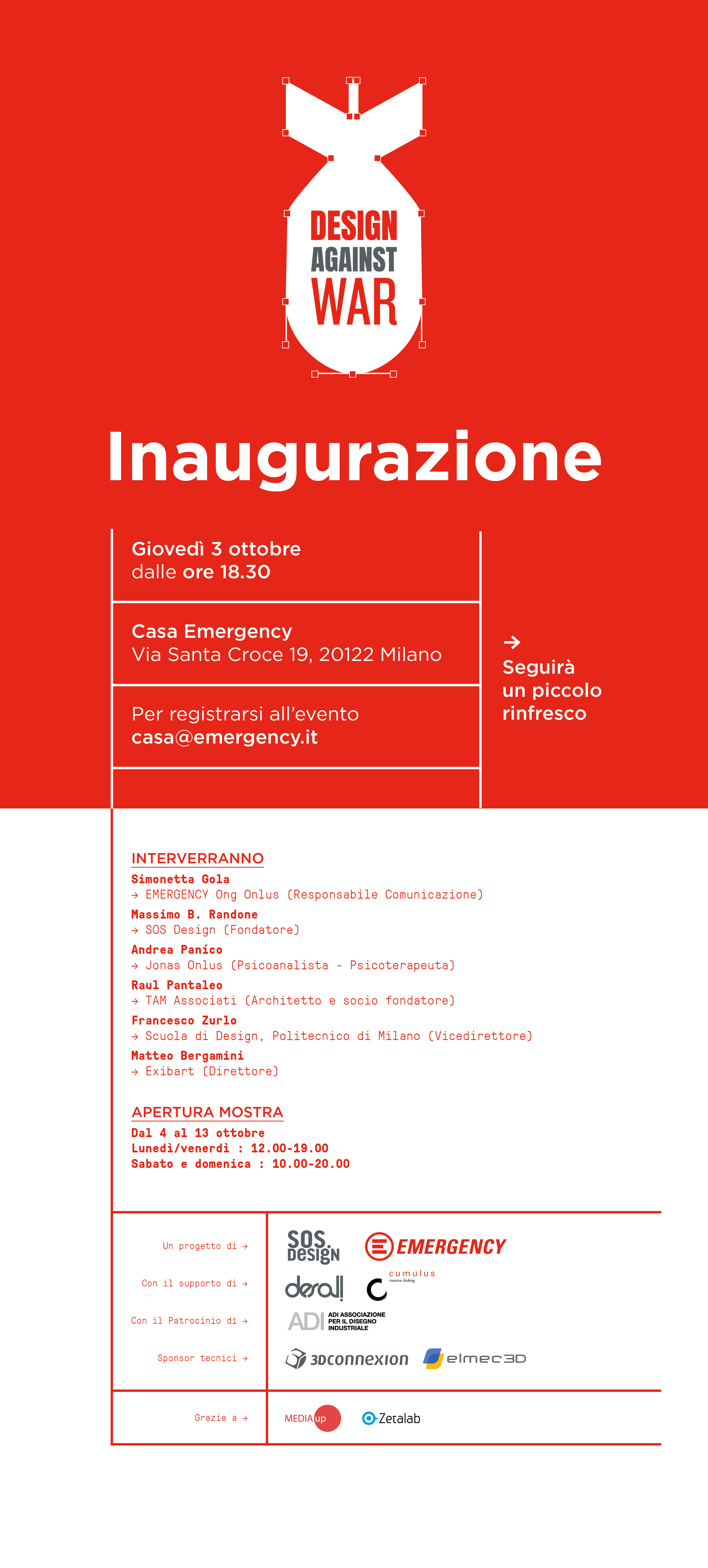 Si svolgerà giovedì 3 ottobre a Casa Emergency a Milano la premiazione della call for ideas Design Against War, ideata da Emergency e SOSDesign con la collaborazione di Desall.com per premiare i migliori progetti di prodotti, ambienti e servizi in territori di guerra. In occasione dell'evento verrà inoltre inaugurata la mostra dei progetti partecipanti, aperta fino al 13 ottobre 2019.