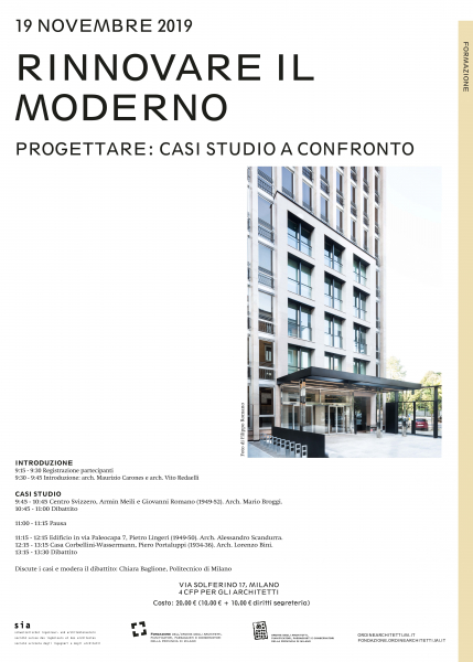 Mario Broggi (Broggi+Burckhardt Architetti) presenterà il progetto per il Centro Svizzero di Armin Meili e Giovanni Romano (1949-52). L'intervento, iniziato nel 2014 e ancora in corso, si propone di migliorare il rendimento energetico e il comfort termico e acustico, agendo sul rivestimento lapideo della facciata, la sostituzione dei serramenti e l'ottimizzazione energetica ed economica degli impianti.