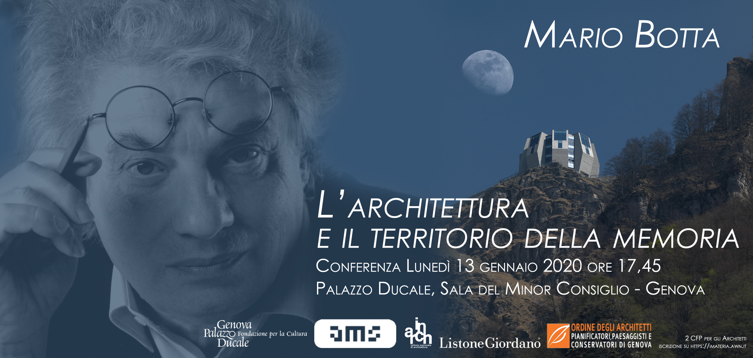 Il Palazzo Ducale di Genova ospita - lunedì 13 gennaio 2020 - l'architetto svizzero Mario Botta per la conferenza "L'Architettura e il tempo della memoria".