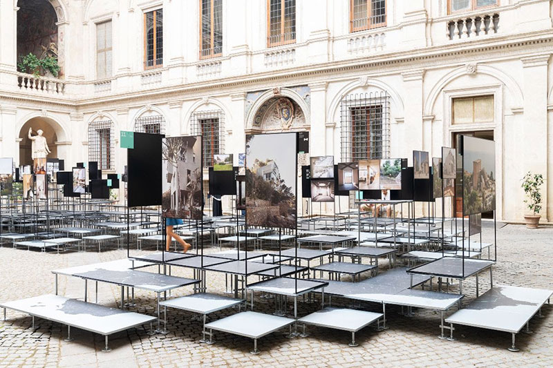 La struttura sopraelevata di 400 moduli stampati delinea una topografia astratta dell'Italia e rivela i luoghi delle architetture documentate dalla campagna fotografica. Sono 108 le stampe di medio e grande formato, come una mappa in rilievo della penisola, che accompagna i visitatori alla scoperta degli itinerari tracciati dai fotografi lungo il territorio italiano, dando loro la possibilità di interagire con le immagini, camminando, attraversando l'installazione ed empatizzando con i differenti sguardi dei fotografi: architettura e paesaggi appaiono così giustapposti, trasformando le prospettive individuali degli autori in un panorama e una mappa collettiva.