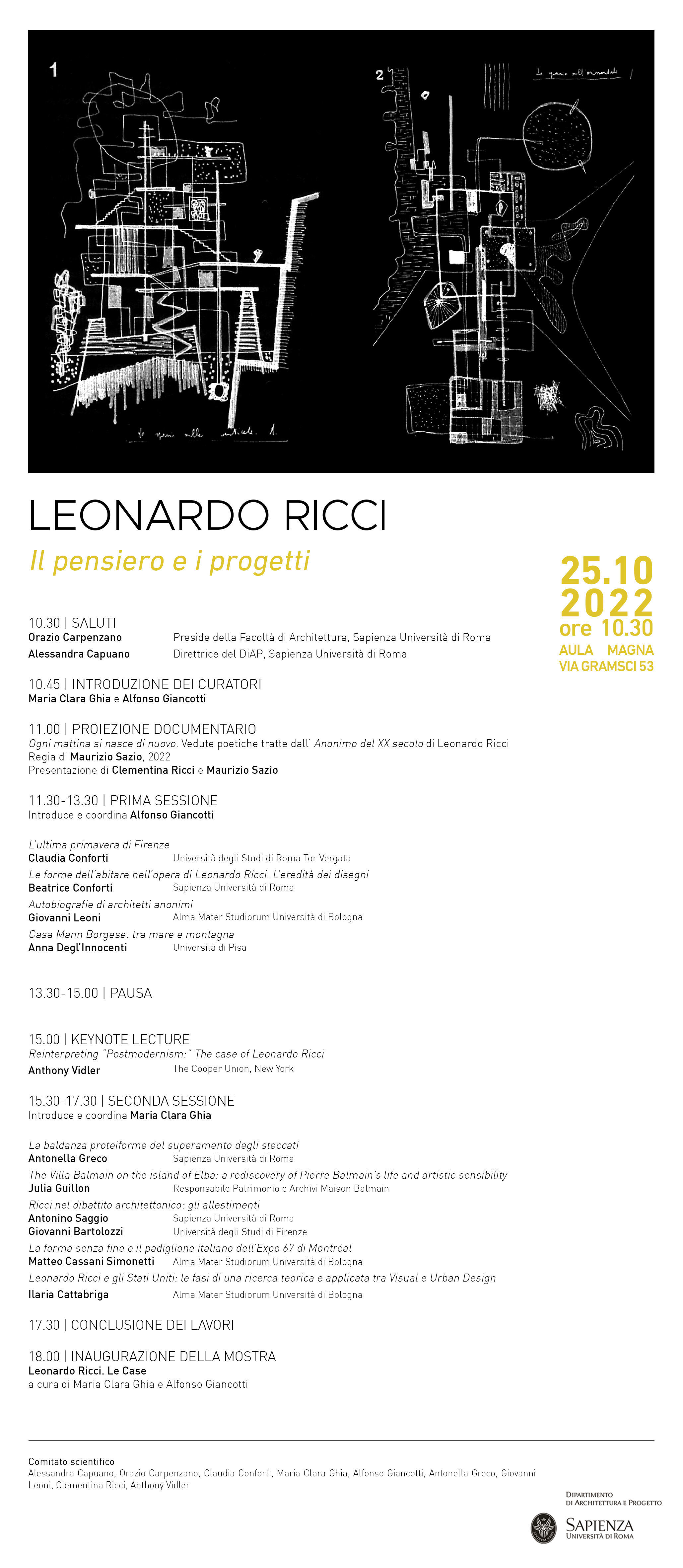 A raccontare le mille sfaccettature di Leonardo Ricci, dall'abitare ai progetti di allestimento, fino al suo rapporto con Firenze e con gli Stati Uniti, saranno critici, docenti universitari e studiosi provenienti dall'Italia e non solo. Tra questi anche Claudia Conforti • Anthony Vidler • Anna Degl'Innocenti • Giovanni Bartolozzi • Matteo Cassani Simonetti • Antonino Saggio.