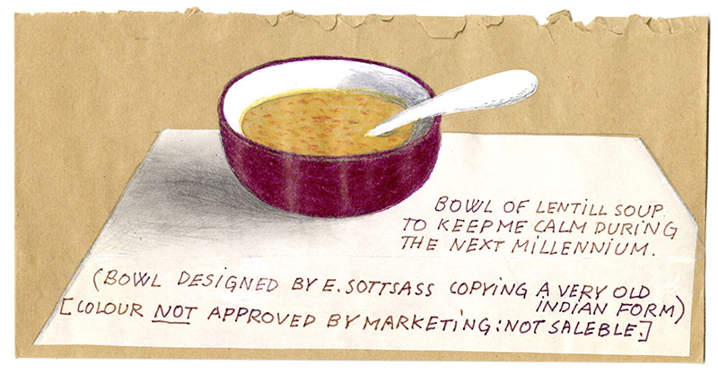 Scodella con zuppa di lenticchie, Buste per anno 2000 e il prossimo millennio, 1999, per Condé Nast Publications, London Courtesy Studio Ettore Sottsass