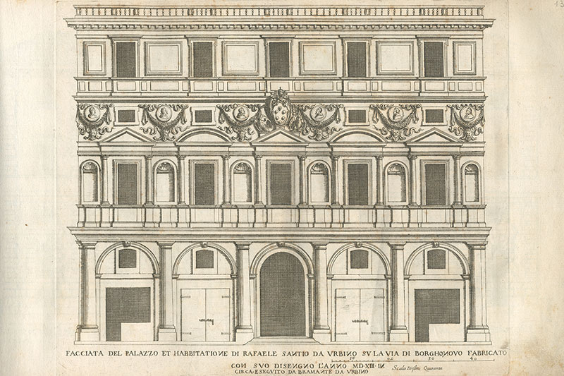 La facciata di palazzo Branconio dall'Aquila a Roma, oggi non più esistente. Da Pietro Fer-rerio, Palazzi di Roma de' più celebri architetti, 1650-1700 (© CISA Andrea Palladio)