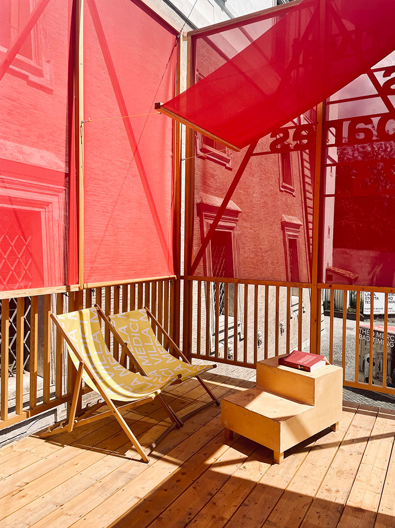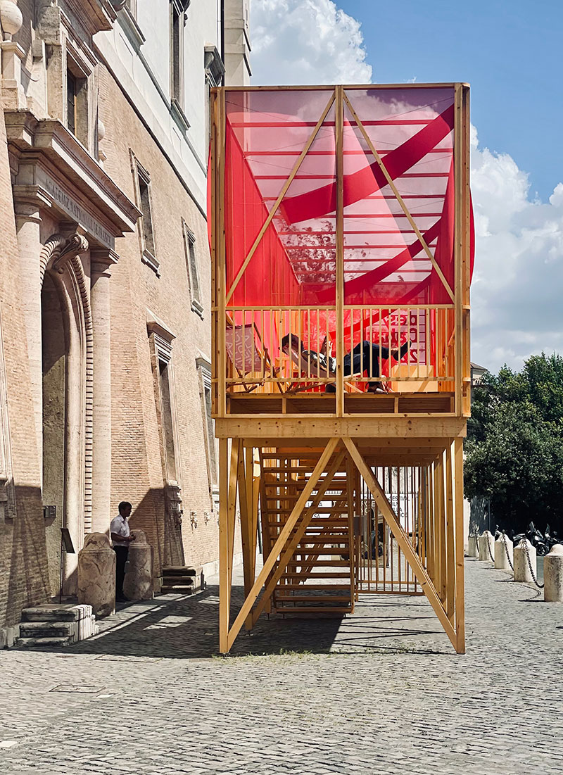 Il progetto del collettivo romano è un invito alla lettura suddiviso in due atti: il primo accoglie il visitatore sul piazzale esterno, davanti all'ingresso di Villa Medici, con una sala lettura sospesa - servita da due scale e protetta da reti di colore rosso - che, gradino dopo gradino, invita i visitatori a cambiare prospettiva e guardare dall'alto la vivacità lungo la strada.