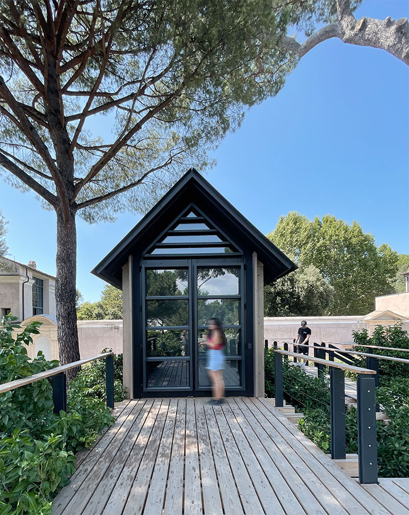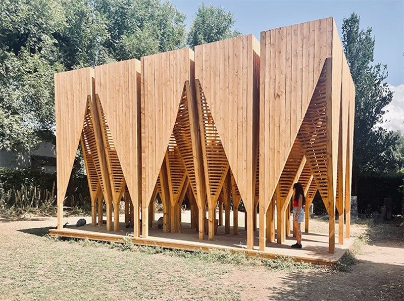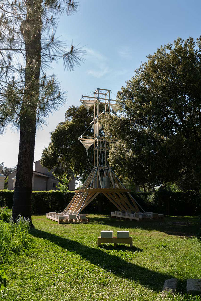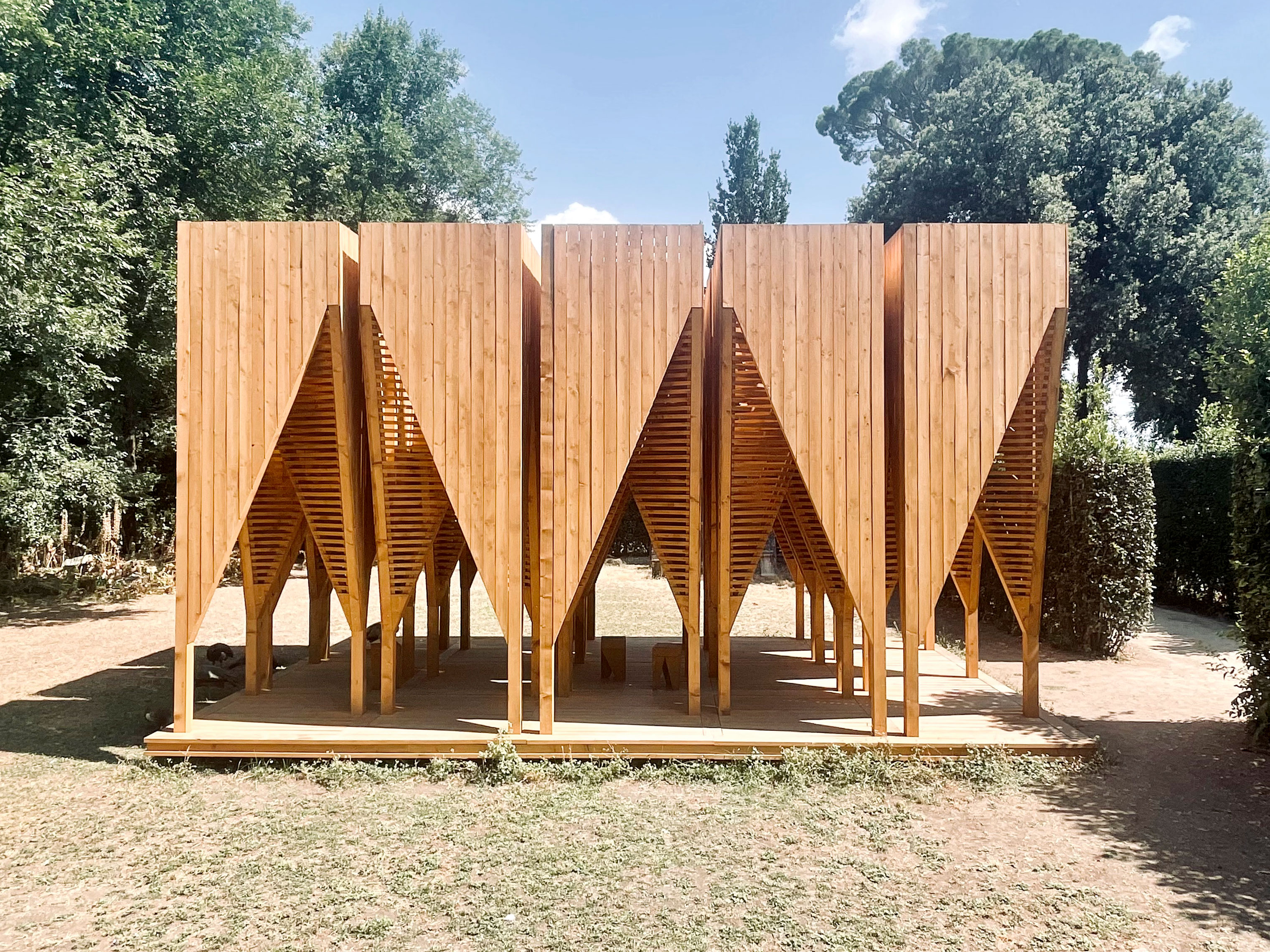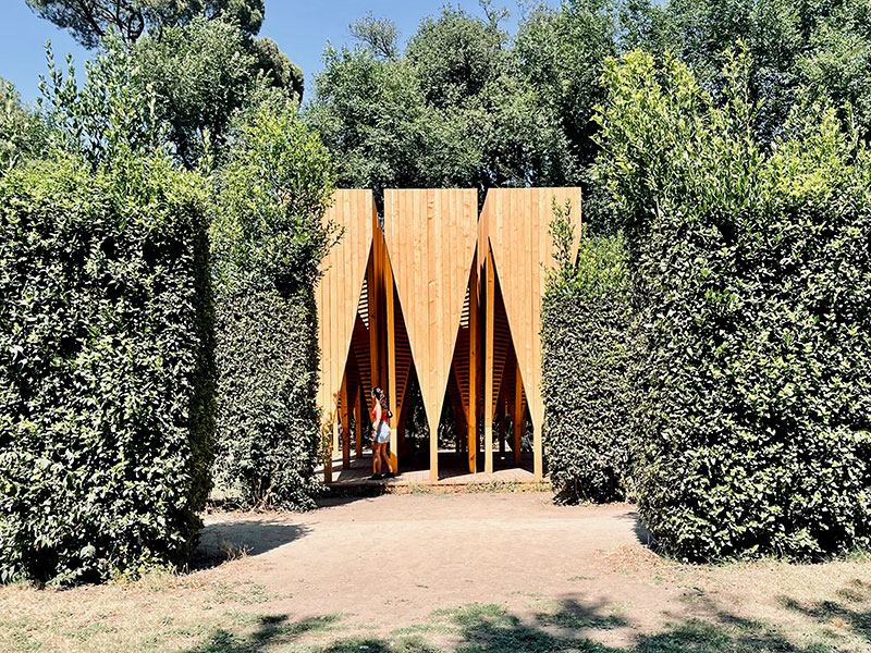 Attraverso una geometria semplice data dalla giustapposizione di quindici moduli identici, la struttura a forma di capanna richiama i giardini storici di Villa Medici, mentre i singoli moduli alludono al pino, simbolo del paesaggio romano, e la loro distanza consente alla luce di penetrare in diversi momenti della giornata.