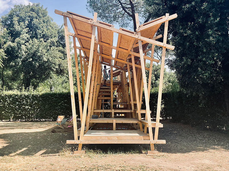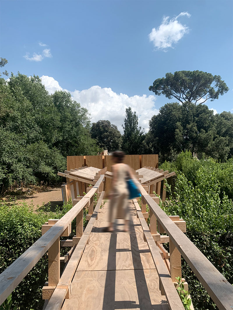 I 7 progetti, elaborati appositamente per il festival dagli studi di architettura e design ArchiSculpteurs, Atelier CRAFT, Atelier Poem, Aurel Design Urbain, Nelson Wilmotte Architectes, offset e orizzontale, offrono un percorso giocoso e interattivo, a tratti labirintico, che oltre a rendere il visitatore protagonista, invita tutti a fermarsi e godere del fresco in mezzo al verde, con occasioni per qualche scorcio su Roma da inedite - e temporanee - prospettive.