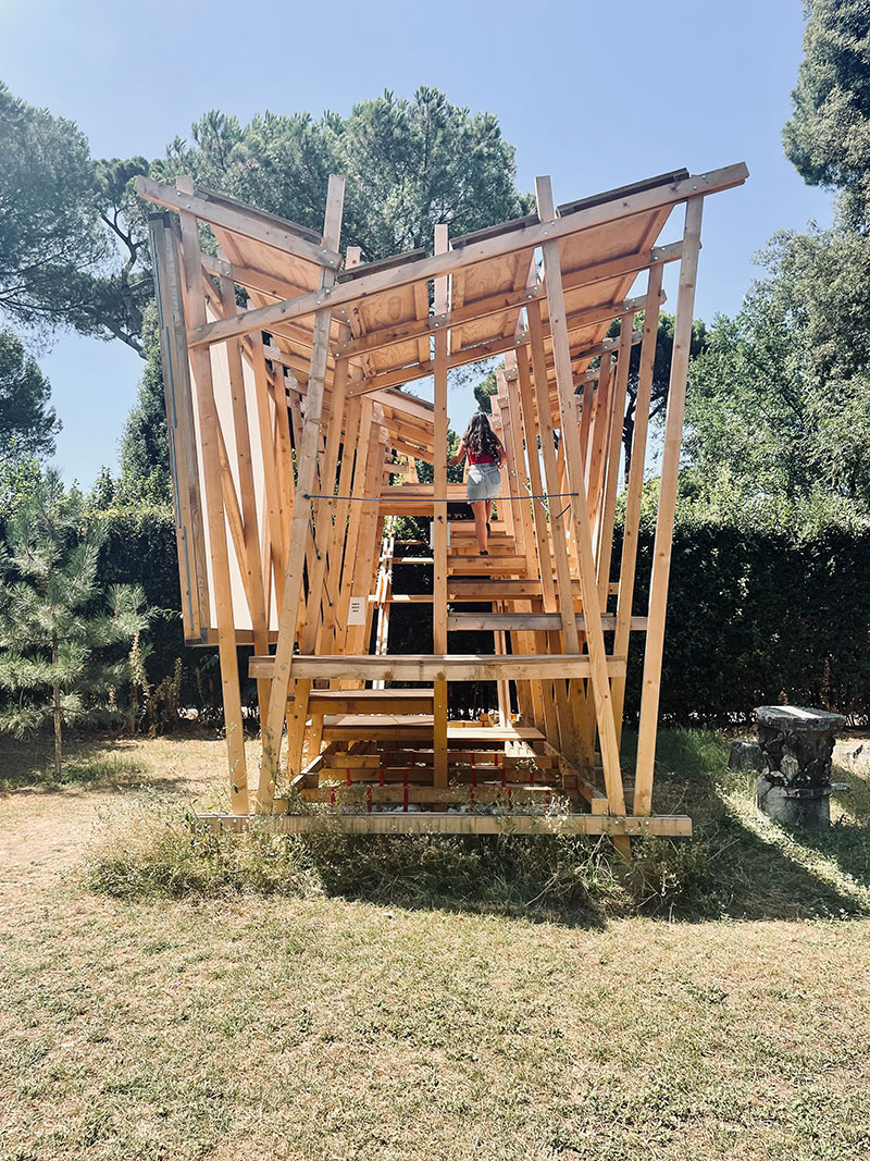 Una forma all'apparenza disordinata, che nasconde un percorso di passerelle per giungere fino al punto più alto di osservazione su Roma e su Villa Medici