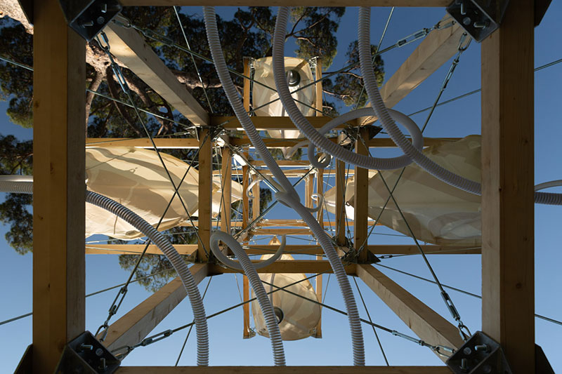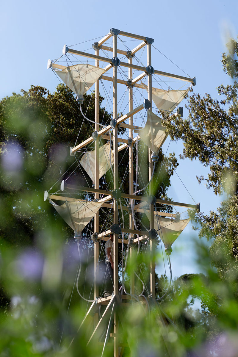 Proprio come un prototipo di albero meccanico, la Parasol Tree House porta il visitatore a comprendere posto dell'uomo all'interno dei cicli naturali in un contesto di sconvolgimento climatico.