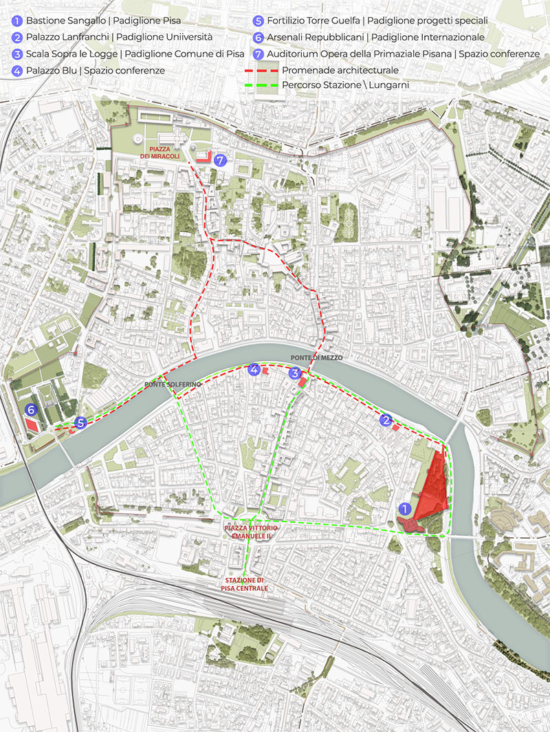 Una Biennale diffusa, inclusiva, partecipativa con eventi e appuntamenti gratuiti che coinvolgono molti luoghi della città: gli Arsenali Repubblicani - dove, oltre alla mostra principale con i progetti di RPBW, Snøhetta e EMBT Benedetta Tagliabue, si svolgeranno anche incontri e presentazioni - il Bastione Sangallo - che ospiterà il Padiglione Pisa con progetti di architetti invitati ma anche con i lavori dei professionisti e degli studenti, i progetti premiati e partecipanti 2022 | 2023 e la mostra fotografica The Wall di Elisabetta Susani - Palazzo Lanfranchi - che ospiterà il Padiglione Università di Pisa e la mostra Le ville progettate da Mies van der Rohe - la Scala sopra Le Logge - che ospiterà il Padiglione Comune di Pisa dove saranno esposti i progetti e le idee per la città - il Fortilizio Torre Guelfa - che ospiterà il padiglione dei progetti collaterali e la mostra su Giovanni Michelucci e le sue opere legate al sociale - l'Auditorium di Palazzo Blu e l'Auditorium dell'Opera della Primaziale.