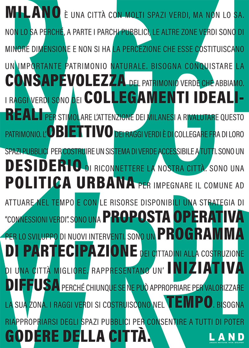 "La Mostra '20 anni di Raggi Verdi' alla Wunderkammer rappresenta l'ulteriore tassello di una strategia avviata a inizio secolo nel panorama milanese, e si inserisce all'interno di un'iniziativa destinata a raccogliere in un unico spazio espositivo i migliori progetti e gli sviluppi delle aree da noi ristrutturate nel corso delle oltre tre decadi di attività dello studio", dichiara Andreas Kipar. "Una tappa cruciale sulla linea del tempo della storia di LAND, sempre aperta a costanti evoluzioni, è ora oggetto di esposizione privilegiato, fruibile a paesaggisti, urbanisti, architetti ma anche ai milanesi interessati al futuro sostenibile della propria città".