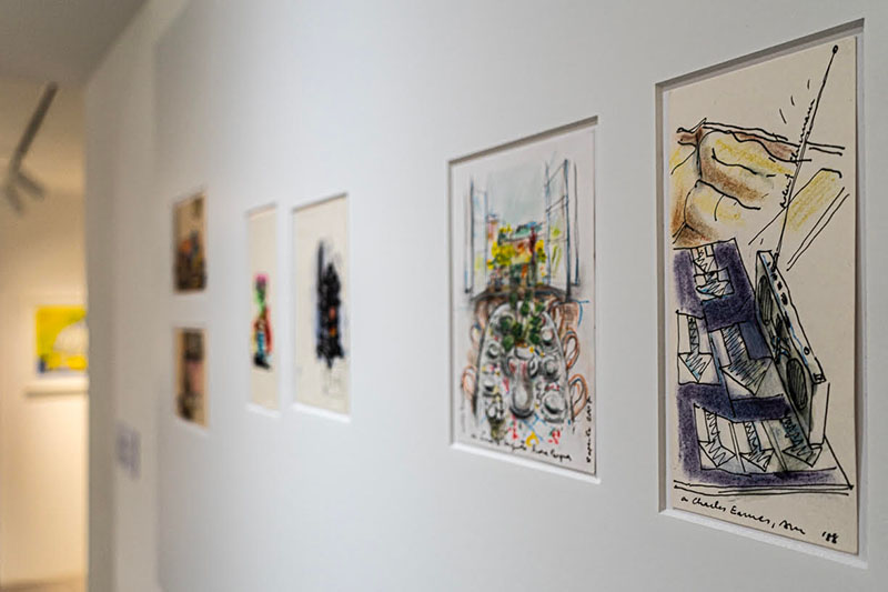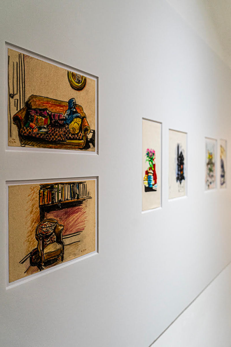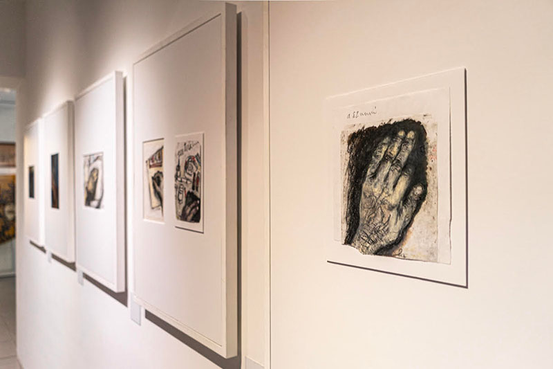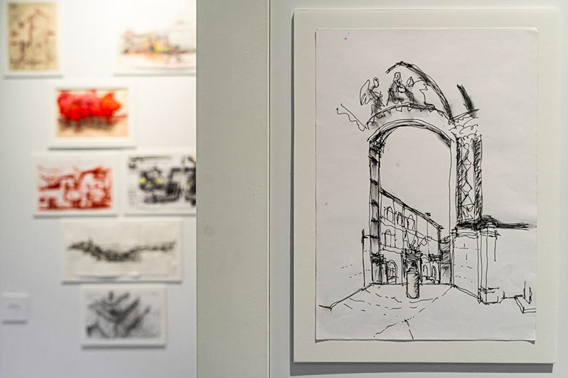 Disegni monocromatici e schizzi a colori si alternano nell'allestimento a creare composizioni intriganti. Tanta carta e tanti segni in uno spazio che ricrea una sorta di antologia di vita vissuta, con frammenti di città che appaiono e scompaiono ma che si offrono come sfondo alle tante opere.