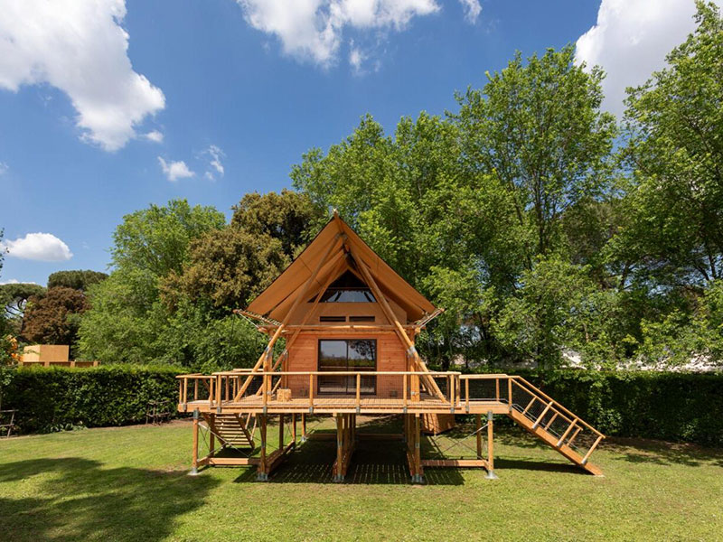 Una Capanna su palafitte realizzata con legno e tela, dotata di tutti i comfort, che evoca l'atmosfera delle notti in tenda, a diretto contatto con la natura. Sospesa sui pali, la cahutte offre comfort e spaesamento, soprattutto grazie alla sua grande terrazza panoramica che sovrasta i giardini di Villa Medici, regalando un ampio scorcio sui tetti di Roma.