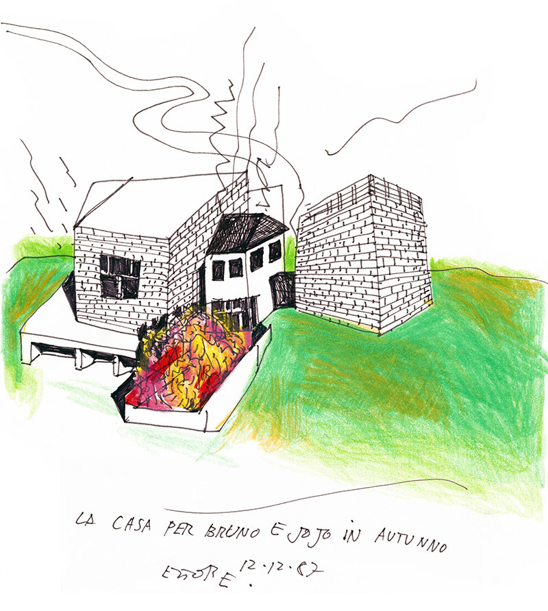 Alcuni brani di questo testo accompagnano a parete gli ingrandimenti dei disegni, corredati da altre riflessioni di Sottsass che fanno emergere la sua volontà di privilegiare nella progettazione "la parte che si abita rispetto a quella che si vede".