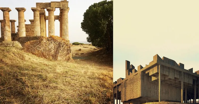 sinistra: Tempio E (di Era o Afrodite), V sec. a.C., Parco Archeologico di Selinunte (Trapani) © Gianluca Peluffo | destra: Moschea a Sokhna, 2019, Monte Galala, Egitto © Peluffo & Partners